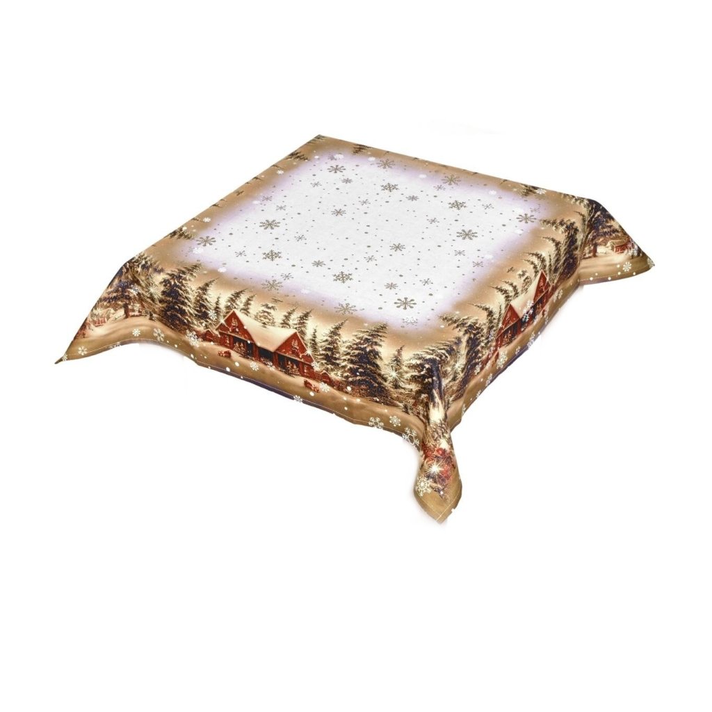 Elegantný vianočný obrus s motívom zasneženej krajiny, domčekov a stromčekov navodí čarovnú zimnú atmosféru. Ideálna dekorácia pre sviatočné stolovanie a výzdobu interiéru.