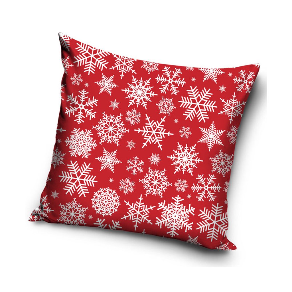 Vankúšik zdobí tradičný vianočný motív bielych snehových vločiek na sýtočervenom podklade