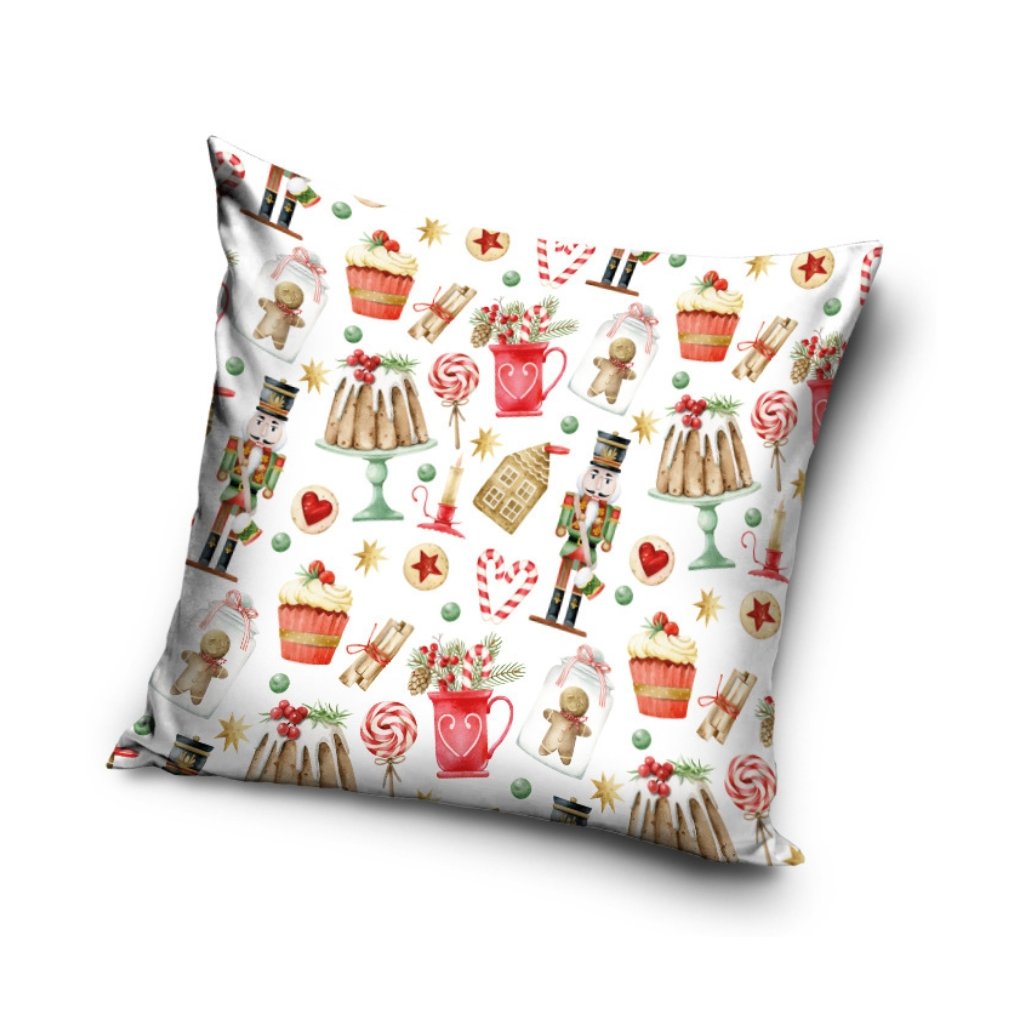 Dekoračný vankúš Luskáčik a sladký svet je vyrobený zo 100 % polyesteru Vianočný vankúš mározmery 40x40 cm a zapína sa na zipsNa bielom vankúši sú obrázky vianočných cukroviniek, koláčikov a Luskáčika Obrázky vyzerajú ako,