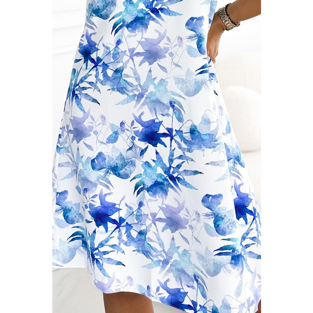 Victoria - voľné trapézové biele šaty s modrým vzorom. K šatám je opasok. Značka numoco. Poľská výroba.