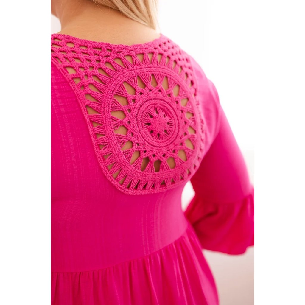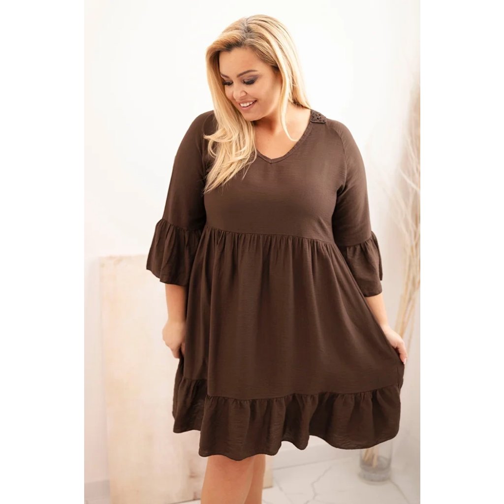 Ak hľadáte šaty, ktoré spájajú ženský štýl s pohodlným nosením, tento variant bude trefou do čierneho! Dámske šaty s volánmi a ozdobnými čipkovanými chrbtami sú skvelou voľbou ako na každodenné nosenie, tak aj na výnimočnejšie príležitosti. Ich voľný, pohodlný strih krásne sadne na postavu a zaisťuje maximálny komfort a vzdušnosť. Rukáv 3/4 zakončený volánom dodáva ľahkosť a spodná časť s volánom vytvára jemný, romantický efekt. Vyrobené zo 100% viskózy, šaty sú mäkké, príjemné na dotyk a ideálne na teplejšie dni. Čipkový detail na chrbte dodáva celku moderný a originálny charakter. Skvelá voľba do práce, na prechádzku alebo stretnutie s priateľmi.
