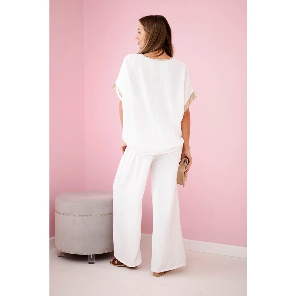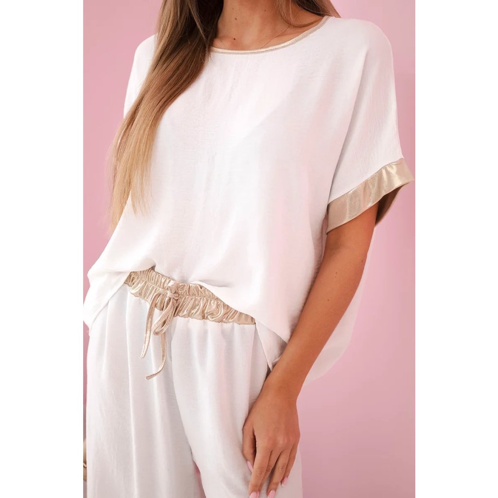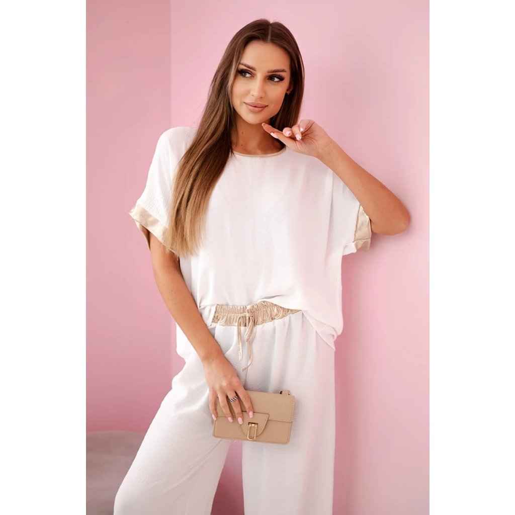 Tento jedinečný komplet spája pohodlie a elegantný štýl, čo z neho robí ideálnu voľbu pre ženy, ktoré ocenia jemné, no výrazné akcenty. Vyrobený z ľahkej, priedušnej viskózy, zaisťuje maximálne pohodlie počas celého dňa. Jemná tkanina krásne splýva s postavou a zvýrazňuje jej prirodzené prednosti. Zlaté lemovanie dodáva celému outfitu výnimočný luxusný vzhľad, priťahuje pozornosť a pridáva eleganciu. Tento komplet je skvelou voľbou na každodenné nosenie, ako aj na formálnejšie príležitosti. Môžete ho kombinovať s obľúbenými doplnkami a vytvoriť jedinečné štýly zodpovedajúce vášmu vkusu. Vyberte si viskózový komplet so zlatým lemovaním a cíťte sa elegantne a štýlovo v každej situácii. Veľkosť je univerzálna a vhodná pre ženy nosiace veľkosti S, M alebo L.