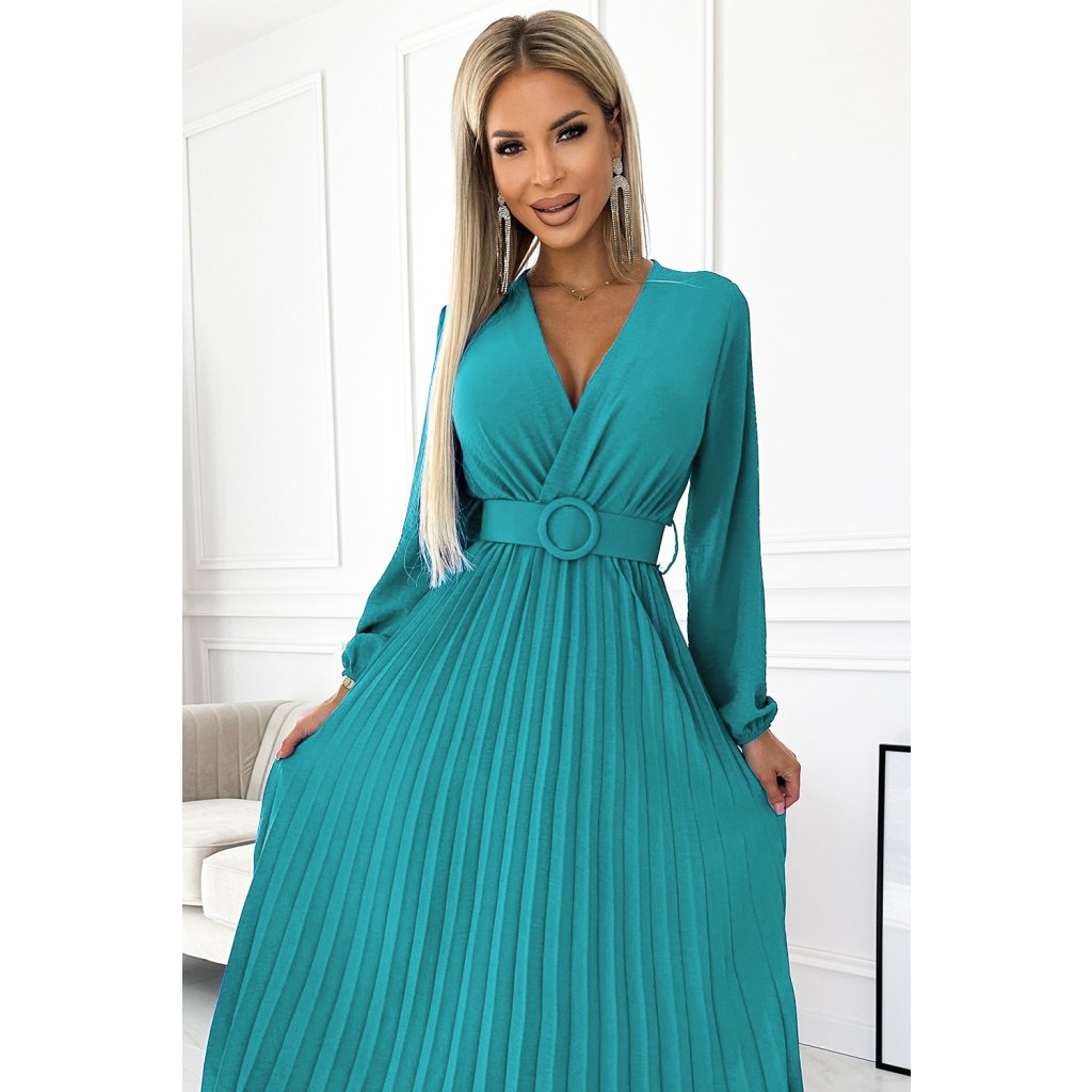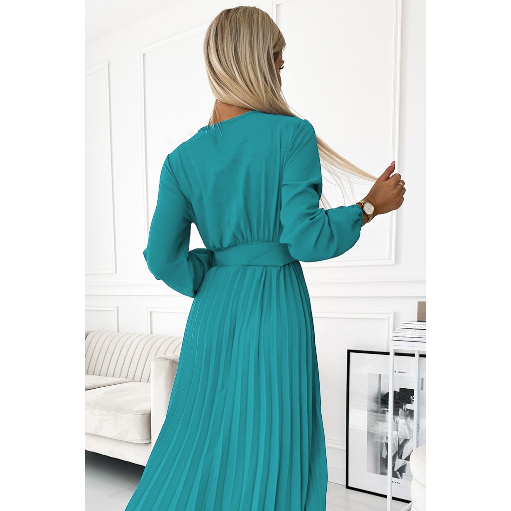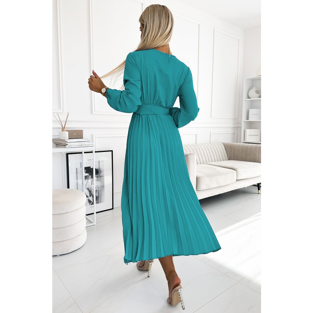 Plisované midi šaty VIVIANA s listovým výstrihom, dlhým rukávom a širokým opaskom. Vyrobené z pokrčeného materiálu vo farbe mora. Perfektné šaty na každú príležitosť. Základná značka Numoco. európska produkcia.