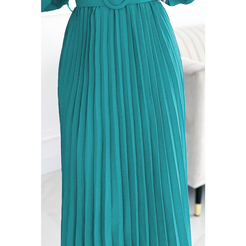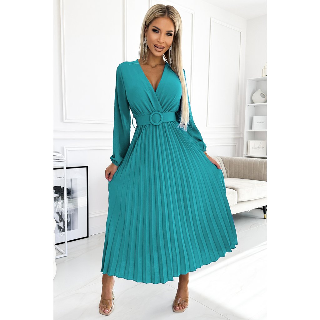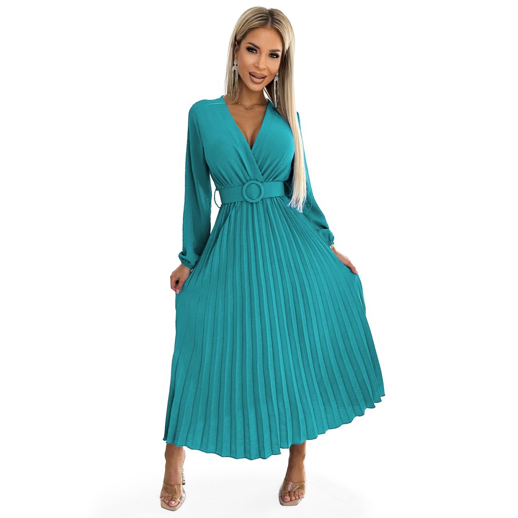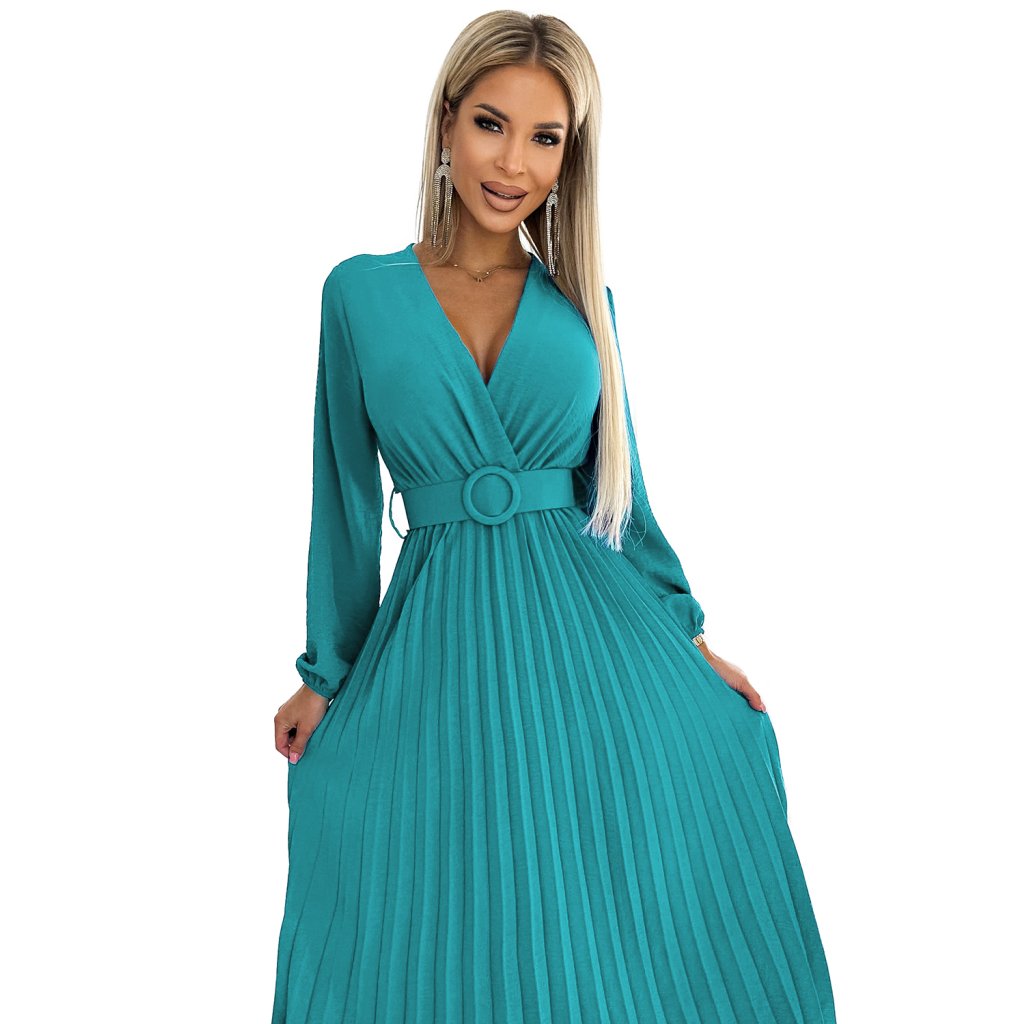 VIVIANA Plisované midi šaty s výstrihom, dlhým rukávom a širokým opaskom - farba mora 504-6