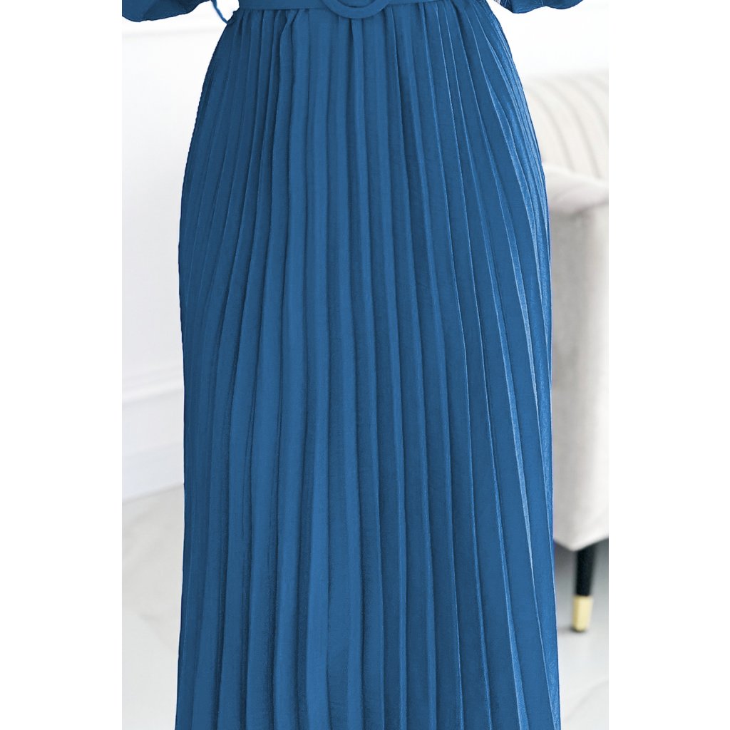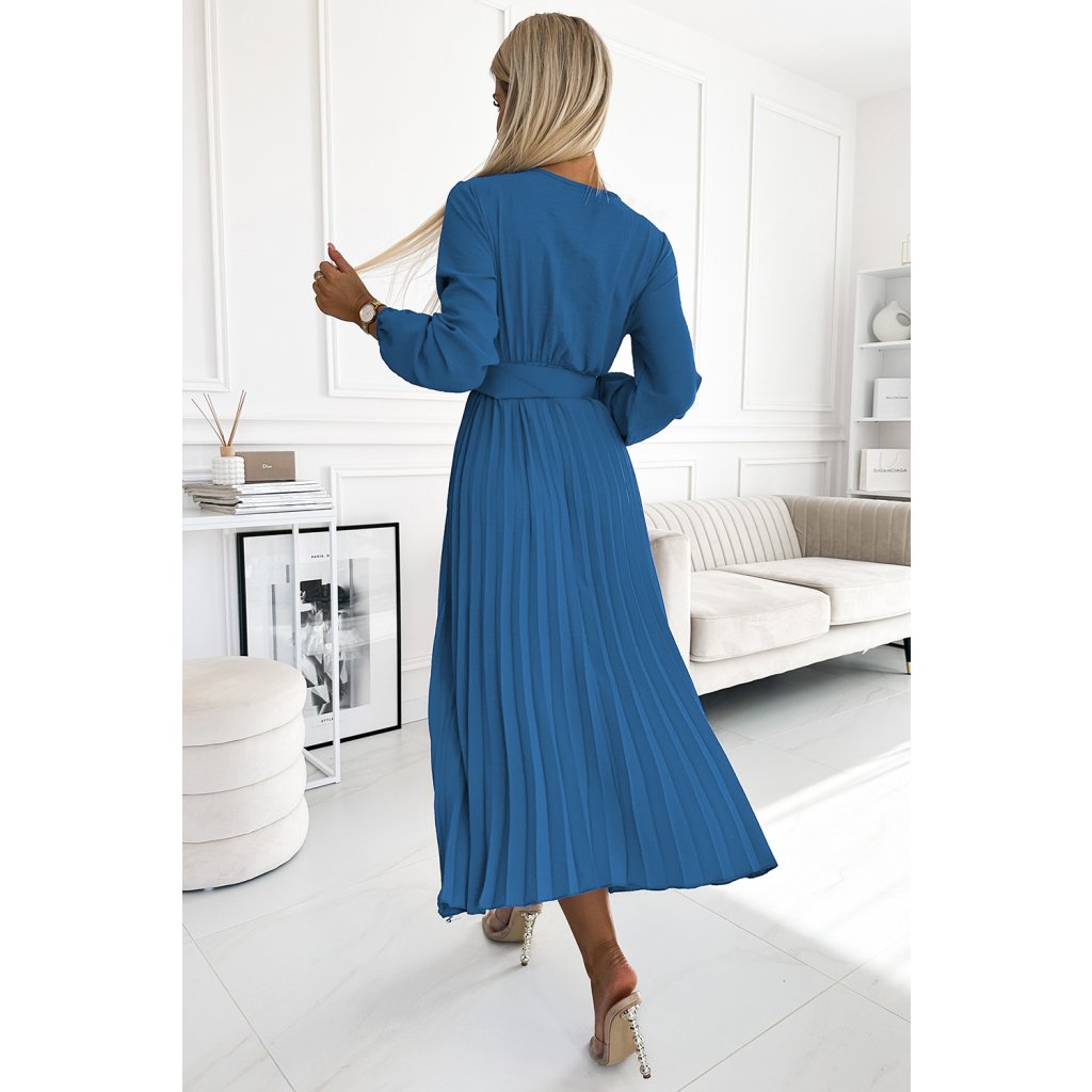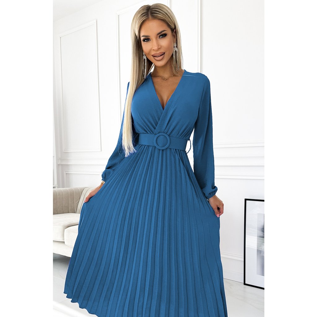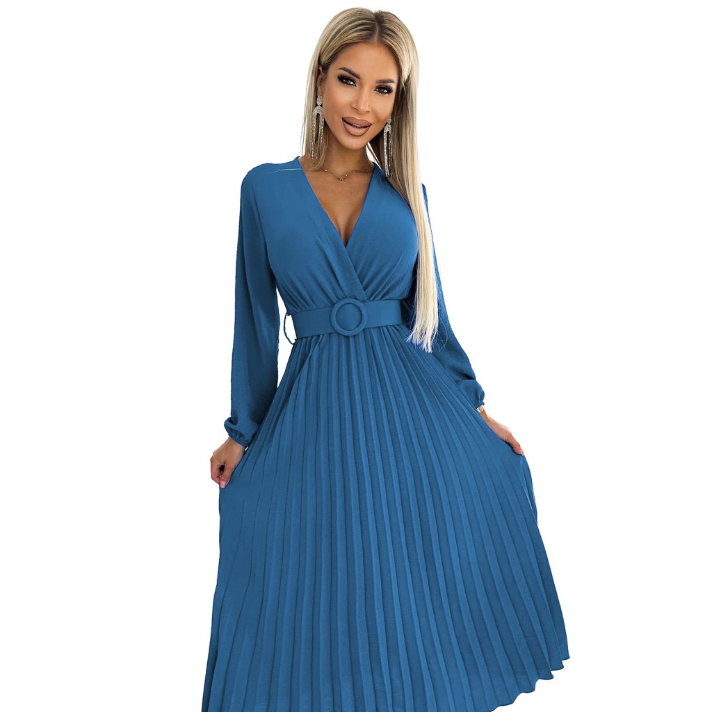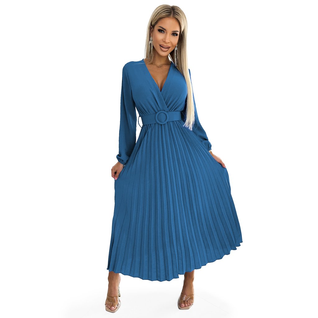 Plisované midi šaty VIVIANA s listovým výstrihom, dlhým rukávom a širokým opaskom. Vyrobené z krčeného modrého materiálu. Perfektné šaty pre každú príležitosť. Značka numoco basic. Európska produkcia.
