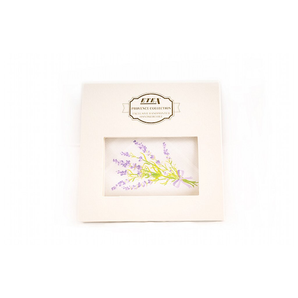 Štýlová vreckovka L35 s motívom levandule, balená v darčekovej krabičke po 1 kuse.