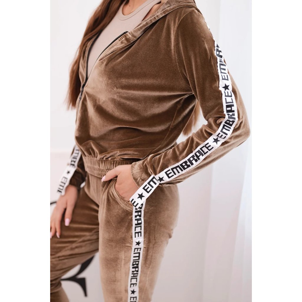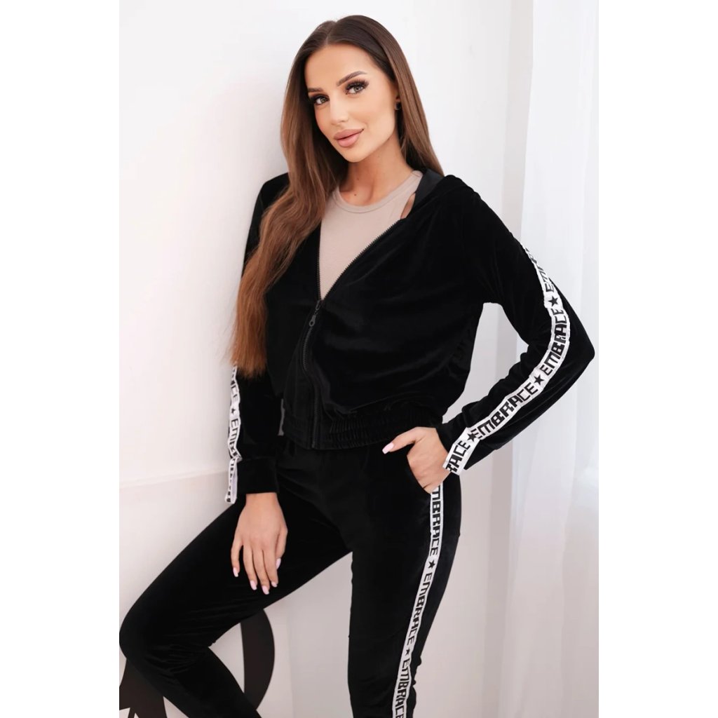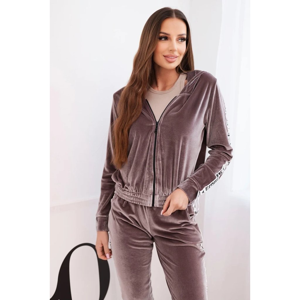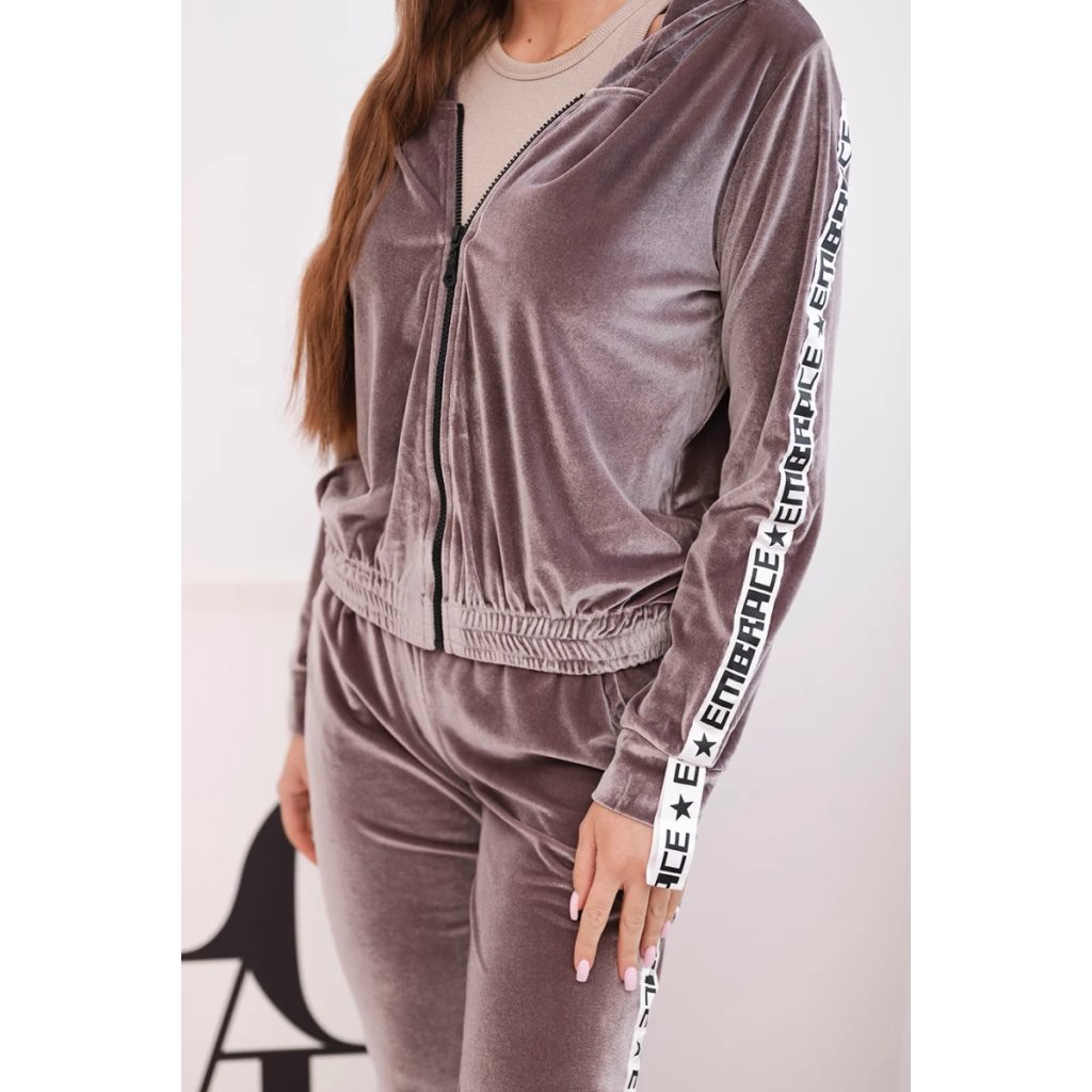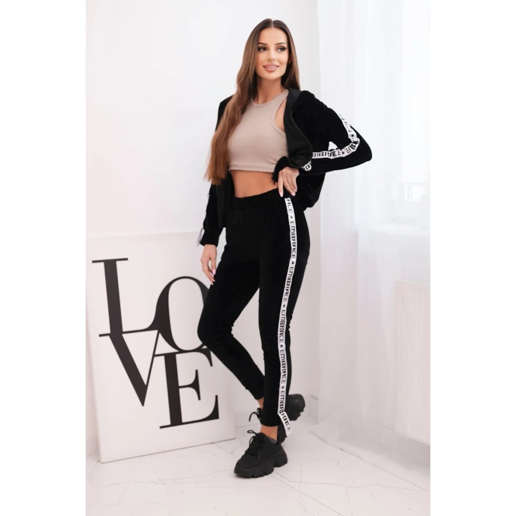 Predstavujeme súpravu mikiny a nohavíc. Súprava z velúru. Mikina má kapucňu a zapínanie na zips. Ozdobná stuha na rameno s nápisom. Spodná časť mikiny je elastická. Nohavice s vreckami a páskou na nohaviciach. Veľmi módny a štýlový set. Súprava je vyrobená z kvalitného materiálu. Veľkosť je univerzálna a hodí sa pre dámy veľkosti S, M alebo L.
