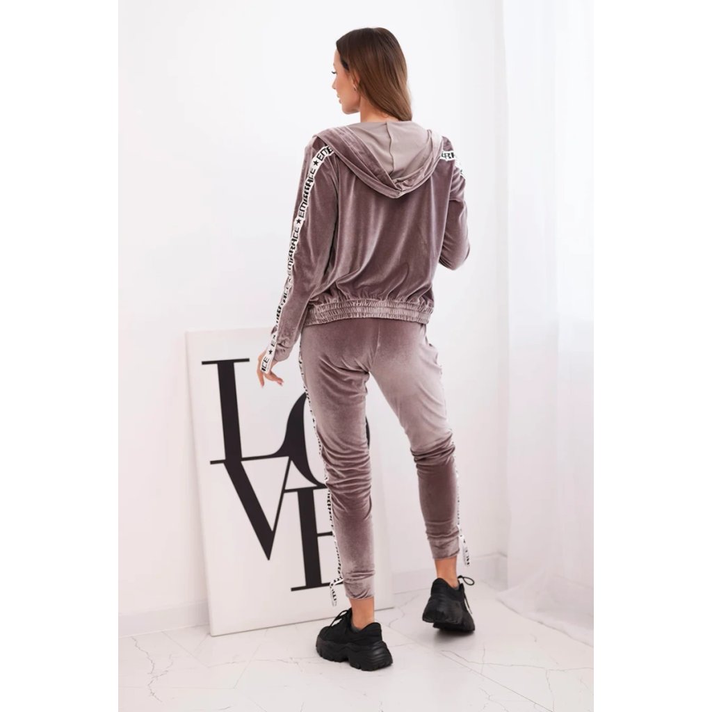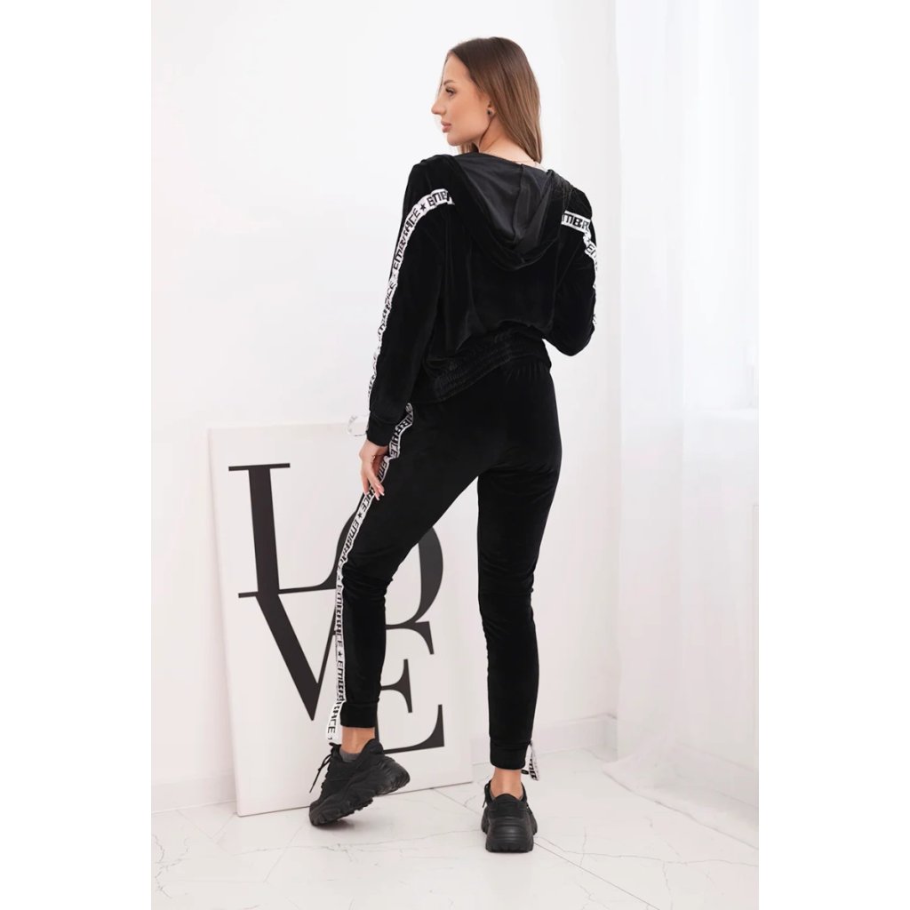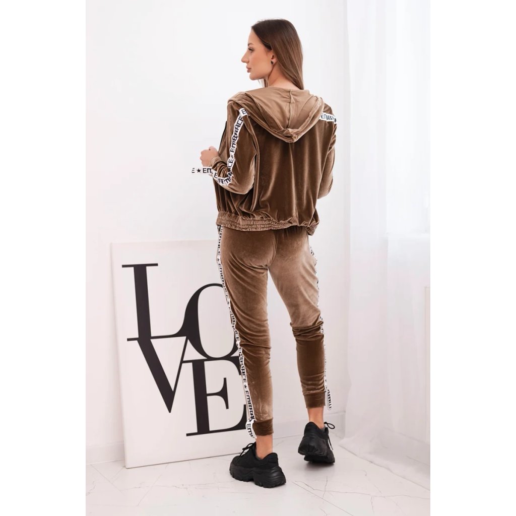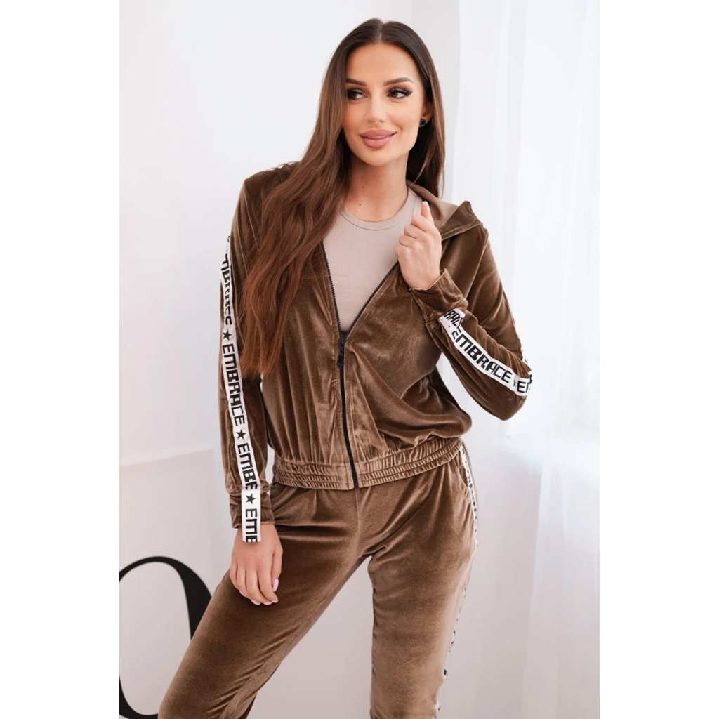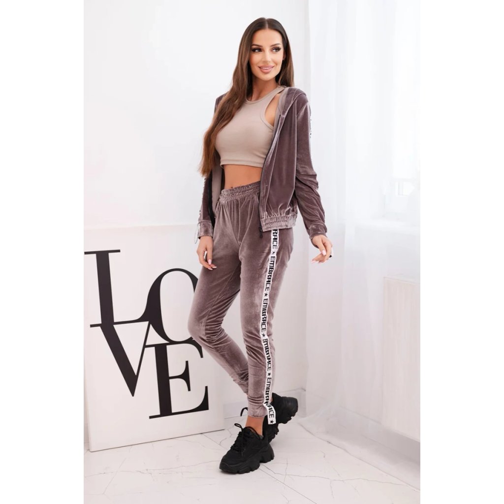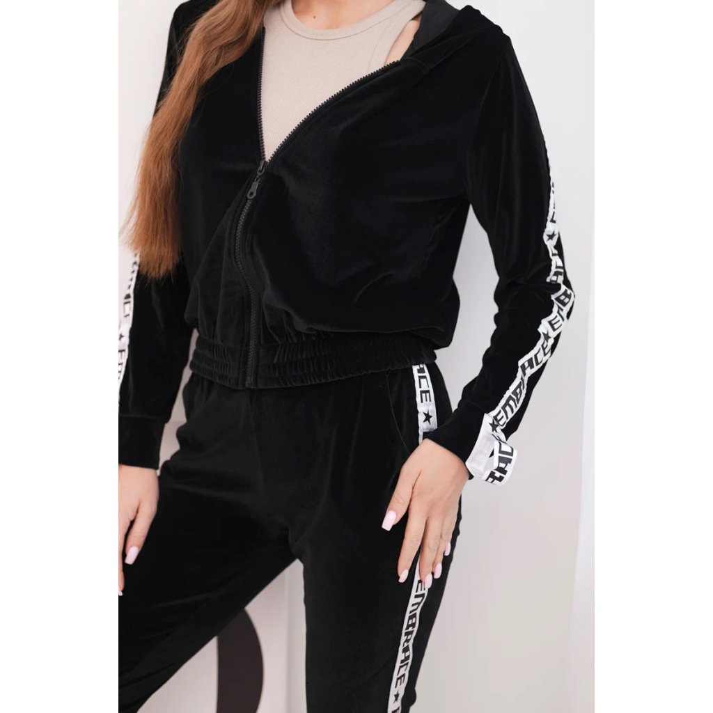 Predstavujeme súpravu mikiny a nohavíc. Súprava z velúru. Mikina má kapucňu a zapínanie na zips. Ozdobná stuha na rameno s nápisom. Spodná časť mikiny je elastická. Nohavice s vreckami a páskou na nohaviciach. Veľmi módny a štýlový set. Súprava je vyrobená z kvalitného materiálu. Veľkosť je univerzálna a hodí sa pre dámy veľkosti S, M alebo L.