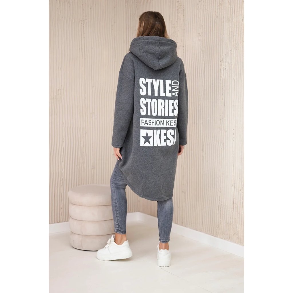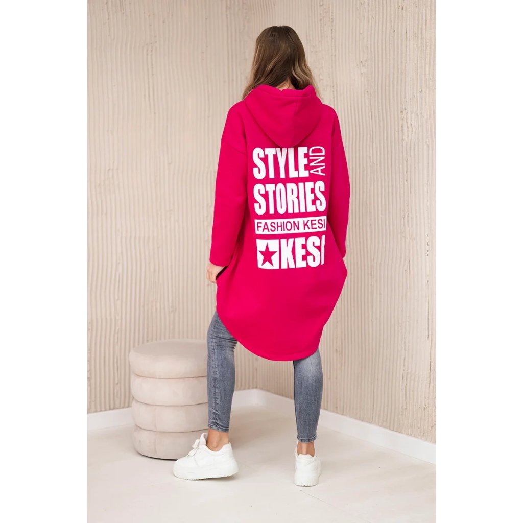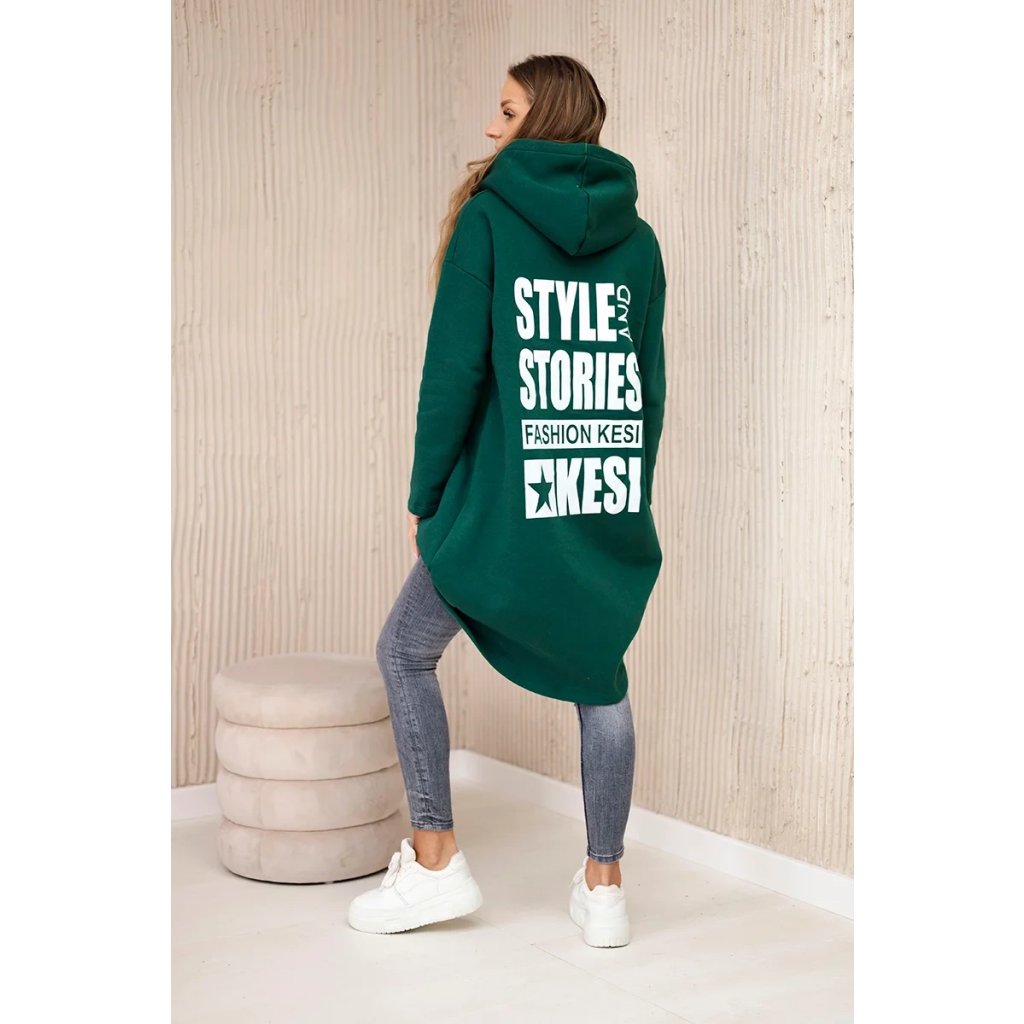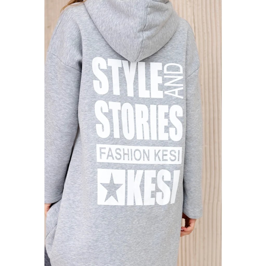 Predstavujeme vám hrejivú mikinu. Mikina má kapucňu, dlhšie zadné a predné vrecká. Na zadnej strane mikiny je potlač. Mikina je vyrobená zo zatepleného materiálu. Veľkosť je univerzálna a vyhovuje dámam, ktoré nosia veľkosť S, M alebo L.