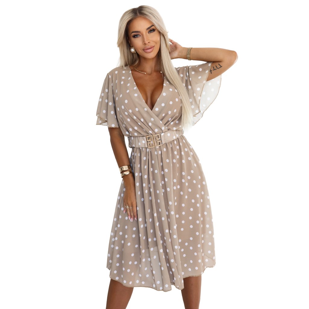 Zmyselné šaty s bielymi bodkami, zavinovacím výstrihom a ozdobným opaskom - béžové 604-3 - výpredaj