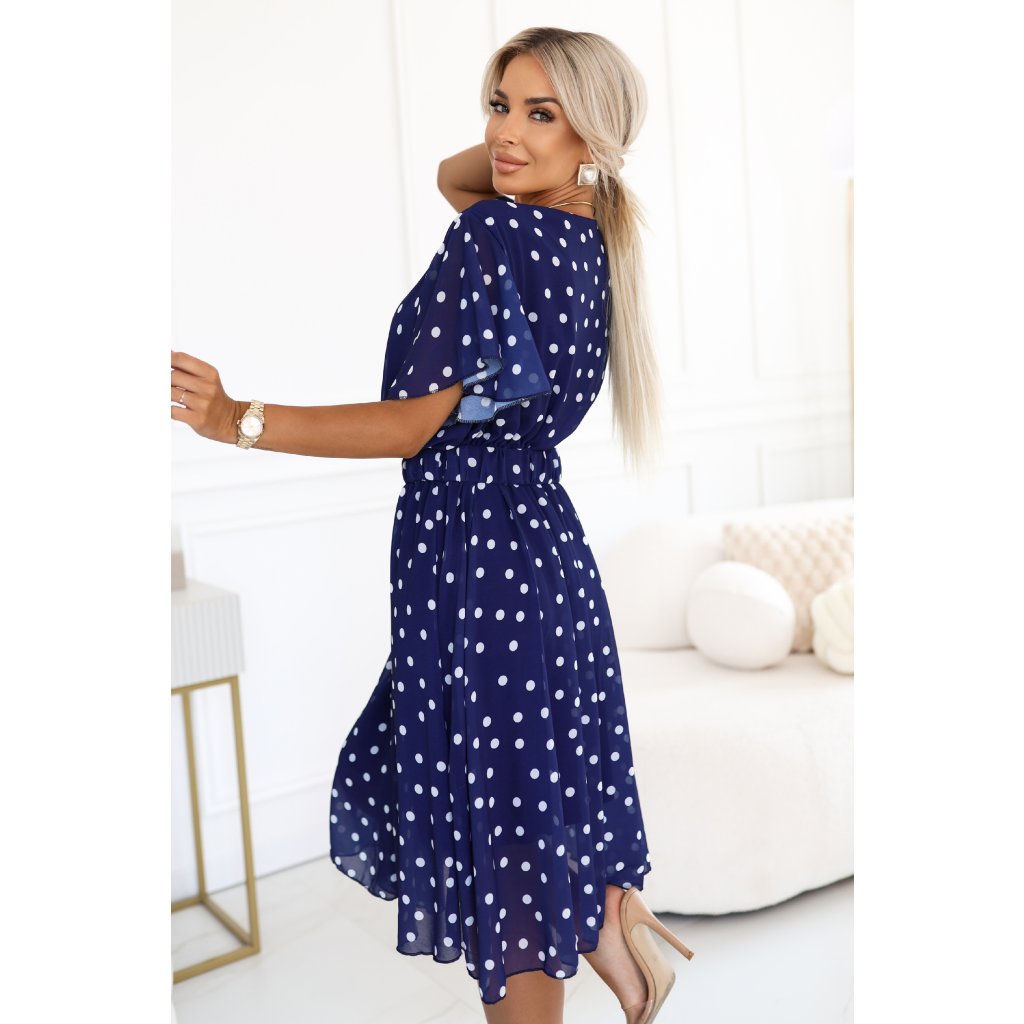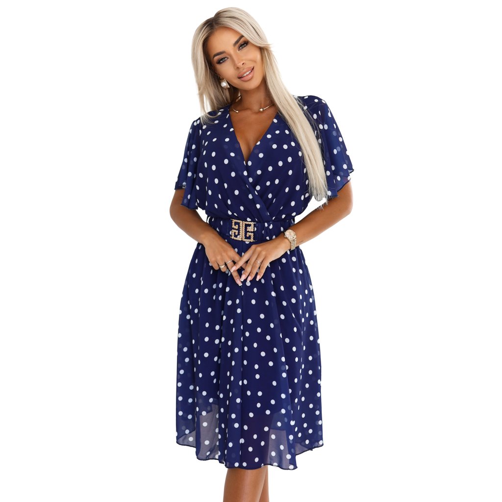 Zmyselné šaty s bielymi bodkami, zavinovacím výstrihom a ozdobným opaskom - tmavomodré 604-4