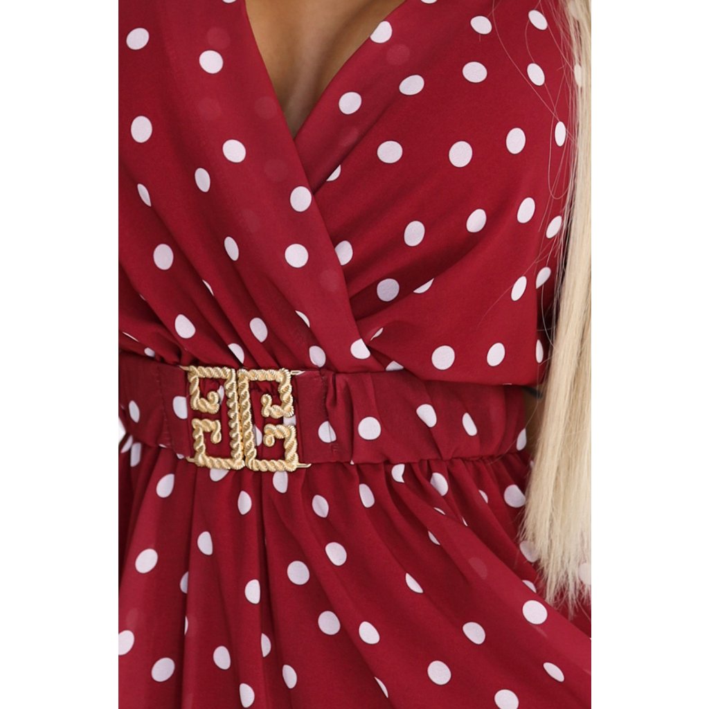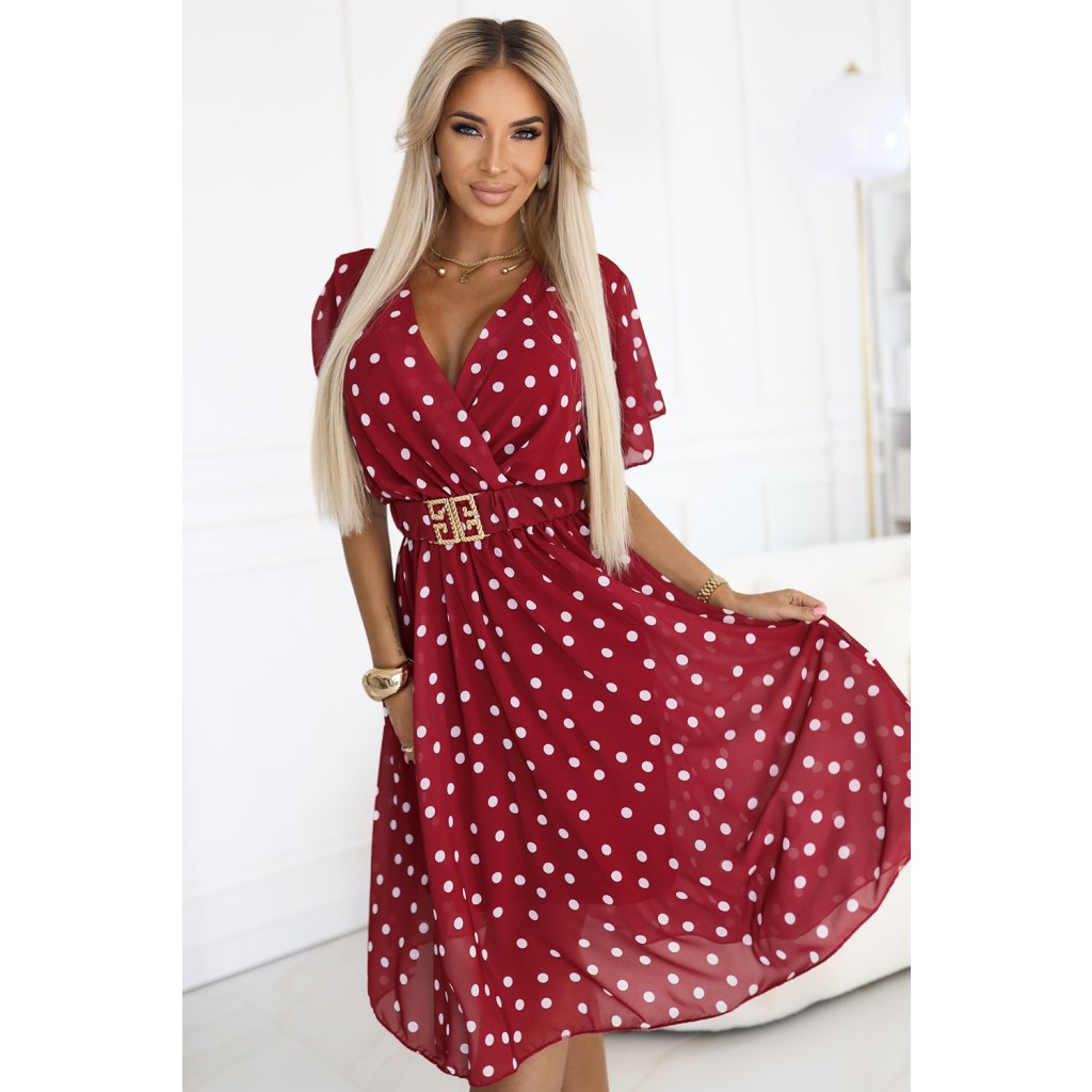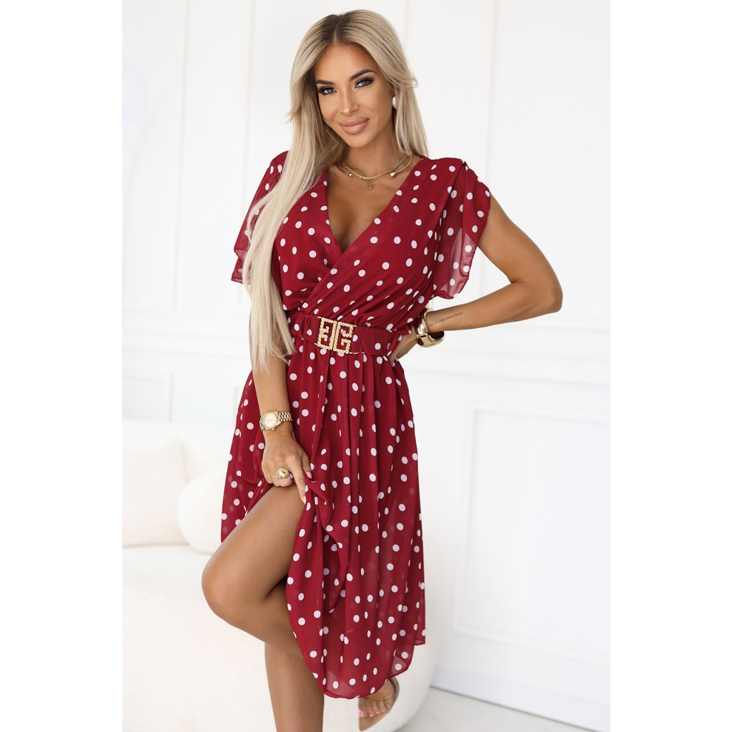 Numoco Zmyselné šaty s bielymi bodkami, zavinovacím výstrihom a ozdobným opaskom - vínové 604-1