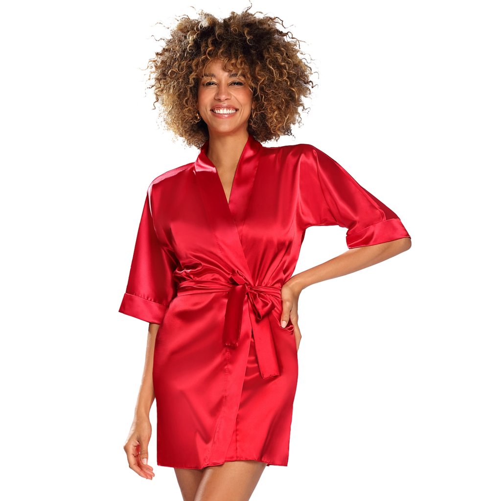 DKaren Župan 90Klasický, krátky župan pre ženy.- S rukávmi po lakte- Pohodlný a pohodlný módny materiál- Pásik v páse- Vyrobený z elegantného saténového materiáluZloženie: 100% polyester.Dodatočné parametre